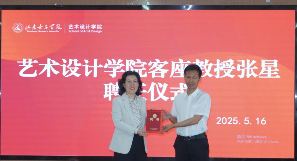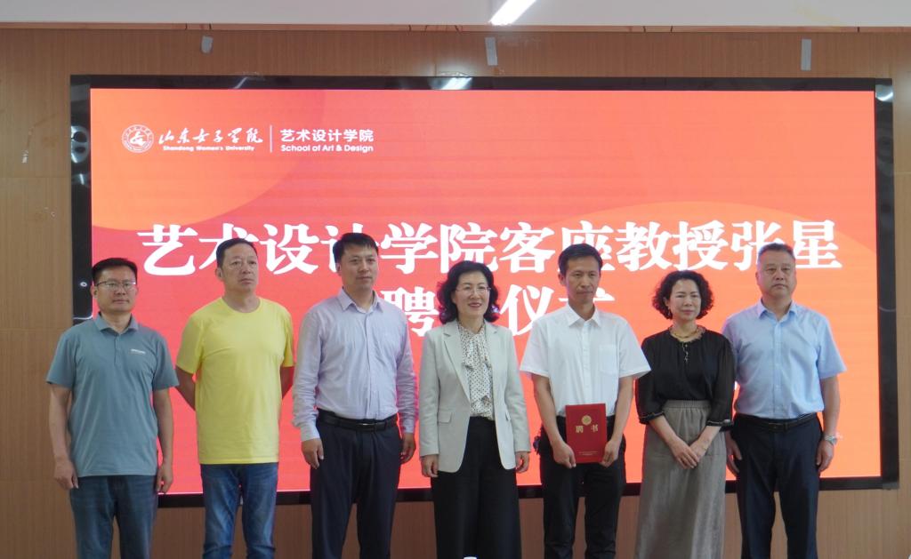 刘恩允为张星颁发“山东女子学院艺术设计学院客座教授”聘书。