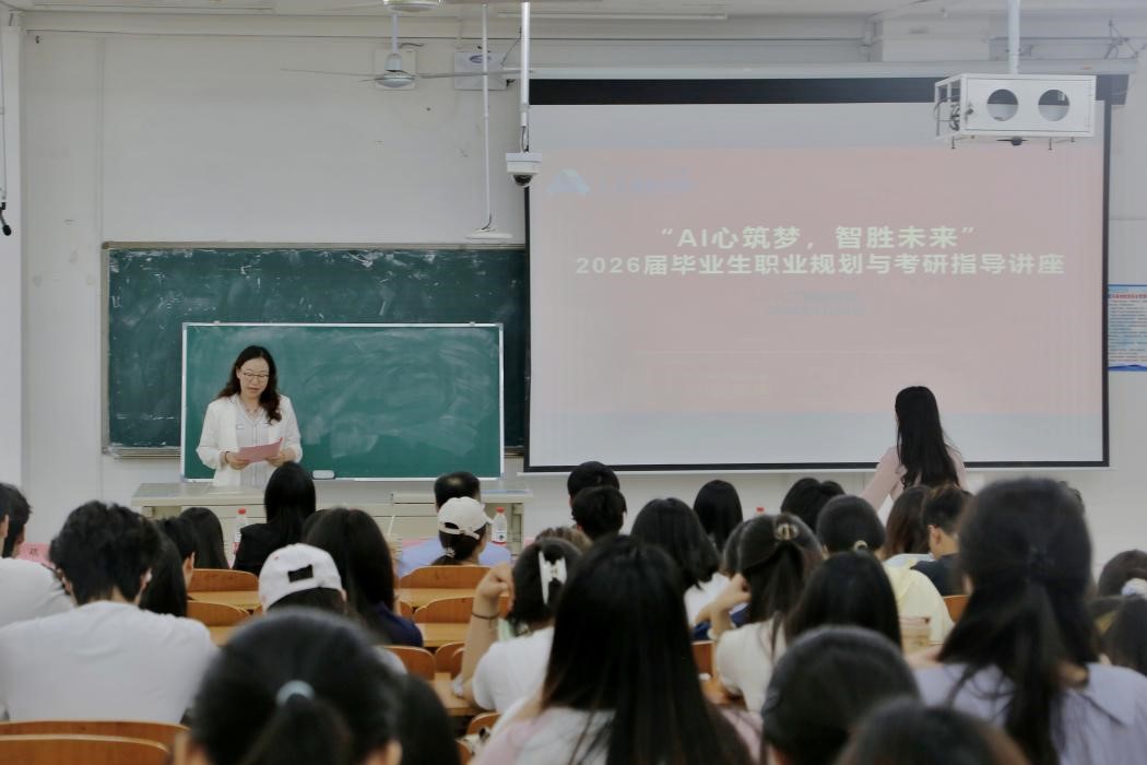 5月29日下午,人工智能学院举办“AI心筑梦,智胜未来”2026届毕业生职业规划与考研指导讲座。华清远见教育集团副总裁李鹏、人工智能技术总监吴昊、高级职业规划师宋学美,人工智能学院党委书记崔江宁、副院长王鲁、全体辅导员,以及2026届毕业生参加活动。