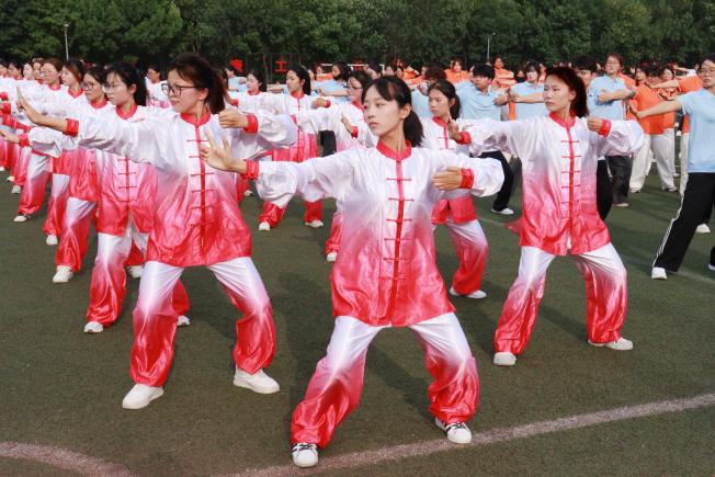 6月5日下午,学校第八届“尚美”文化艺术节之第十八届“阳光课间操”八段锦展演赛在田径场举行,团委、学生工作处、体育教学部的老师担任评委,各学院学生代表担任大众评委,39个团支部千余名学生共同参赛。