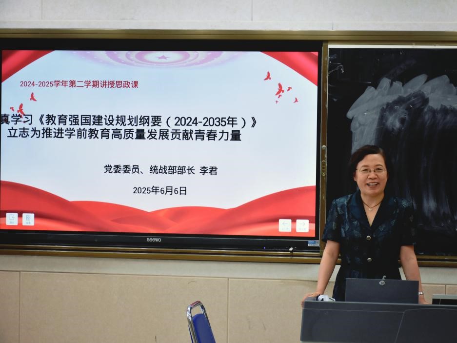 为深刻领会《教育强国建设规划纲要(2024-2035年)》战略部署,激发学院学子投身教育强国建设的使命感。6月6日上午,学校党委委员、统战部部长李君为教育学院24级创新实验班讲授主题为“认真学习《教育强国建设规划纲要(2024-2035年)》,立志为推进学前教育高质量发展贡献青春力量”的思政课。党委副书记路敏以及24级创新实验班全体同学参加。