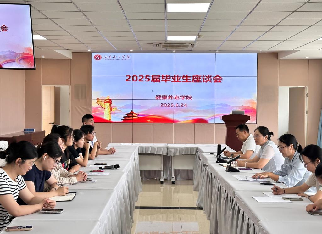 骊歌渐起,情谊绵长。在毕业季来临之季,为倾听学子心声,凝聚发展智慧, 6月24日,健康养老学院2025届毕业生座谈会在求真楼610召开。学院党委书记赵丽丽、副书记陈涛,辅导员于苗与18名毕业生代表共聚一堂,畅谈成长感悟,共谋发展良策。