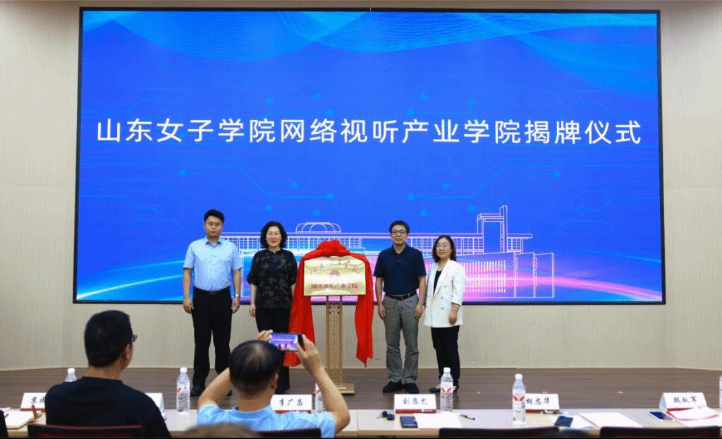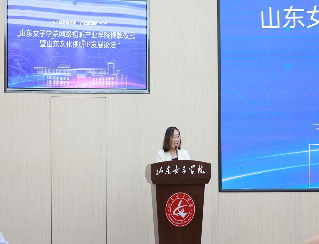 为响应国家文化强国与网络强国战略,深化产教融合,推动影视传媒教育与数字产业协同发展。7月18日,山东女子学院网络视听产业学院揭牌仪式暨山东文化视听IP发展论坛在求真楼报告厅举行。校副校长刘恩允出席会议,山东省广播电视局、大众报业集团、山东师范大学、山东省中国传媒大学校友会,以及长清区网络视听产业园区相关企业负责人,传媒学院领导班子成员、师生代表参加会议。