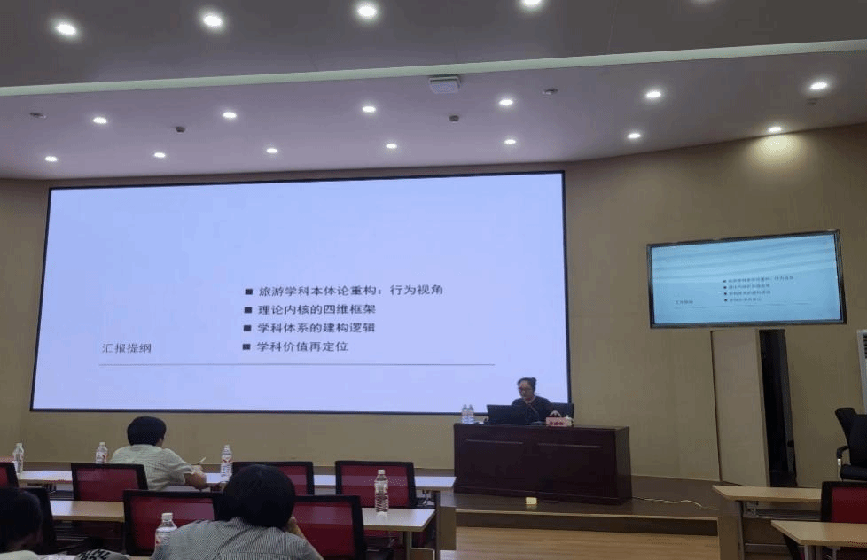 贾衍菊教授以《主客共享发展理念下主客乡村依恋与旅游价值共创》为题作报告。她指出,秉持主客共享与互动实现价值共创是乡村旅游地供给侧改革关键。其研究融合多学科理论方法,探究主客乡村依恋到旅游价值共创的递进机制,以解决乡村旅游地转型中的相关科学问题。何小芊教授以《东华理工大学“旅游地学与规划工程”专业建设情况》为题展开报告。他主要介绍了该专业是依托多学科形成的交叉课程体系,通过实习基地建设与研究生教育国际合作,构建了完善育人体系。梳理了旅游地学与地学旅游、地质旅游的概念关系,并分享了对该学科研究发展和深度思考。黄潇婷教授在《以旅游行为为内核的旅游学科理论体系思考》主题报告中阐释了包含本体论重构、理论内核四维框架、学科体系建构逻辑及价值再定位的完整研究框架。她重点强调了流动性研究的核心地位与以人为本的理念,倡导构建旅游实验研究范式,以推动学科交叉及凸显旅游学科的独特价值。