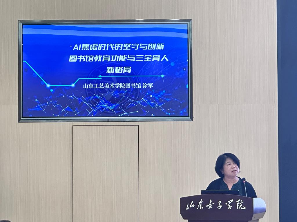山东工艺美术学院图书馆副馆长涂军作《AI焦虑时代的坚守与创新——图书馆教育功能与三全育人新格局》的报告。报告以环境、资源、服务、活动育人为主线,探讨在AI技术浪潮的挑战下,图书馆如何在信息素养教育、文化育人等方面保持定力与坚守,融合新技术拓展服务场景,构建全员、全程、全方位的育人新生态。