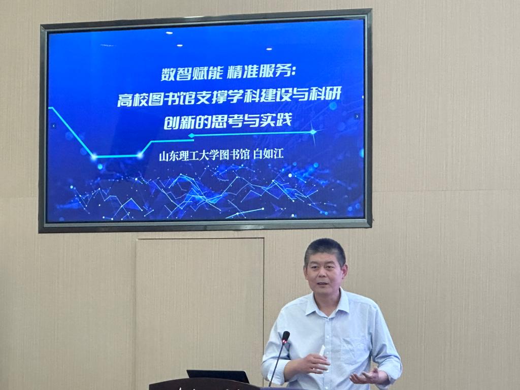 山东理工大学图书馆副馆长、信息管理学院副院长白如江作《数智赋能精准服务:高校图书馆支撑学科建设与科研创新的思考与实践》专题报告。报告以数智赋能图书馆学科建设与科研创新服务为主线,以学校图书馆学科服务实践为抓手,系统介绍了如何利用数智化先进技术,构筑以数据驱动为核心、嵌入科研全流程等的智慧知识服务体系,实现从资源仓储者向知识创新催化者的范式转型。