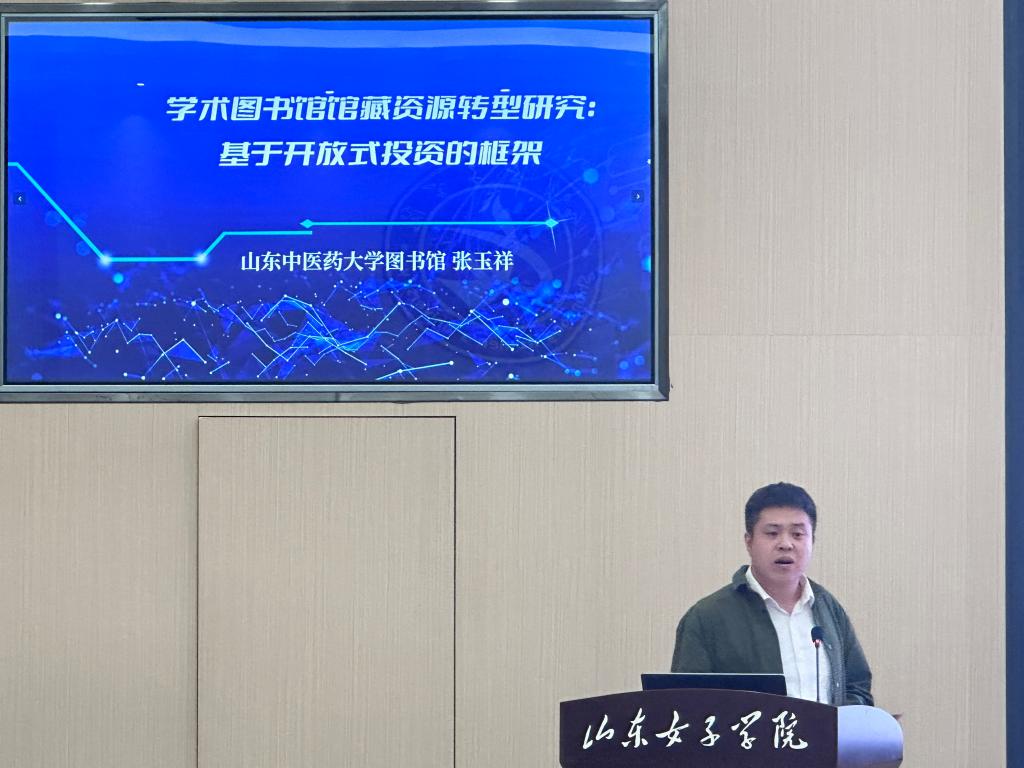 山东中医药大学图书馆张玉祥主任作《学术图书馆馆藏资源转型研究:基于开放式投资的框架》报告,提出面对数字资源日益增长和经费受限的双重压力,图书馆应积极探索资源共建共享与开放获取模式,通过优化资源配置策略,推动馆藏结构从“占有”向“获取”、从“纸电并存”向“数字优先”的战略转型。