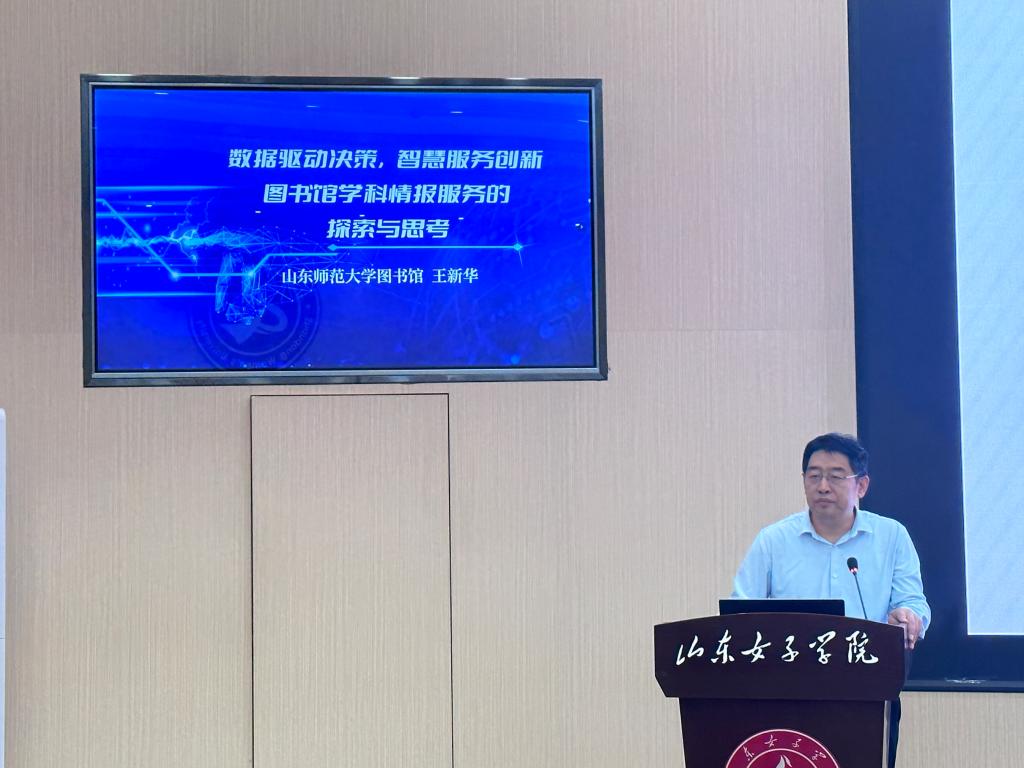 山东师范大学图书馆馆长王新华代表长清大学城高校图书馆联盟致辞。他在肯定联盟成立以来既往成绩的同时,指出当前图书馆事业正面临深刻变革。他强调,各联盟成员馆应聚势赋能,以开放协作的姿态共迎新技术、新思想,通过深度研讨汇智聚力,共谋创新发展路径,以期开创长清大学城高校图书馆服务的新局面。在随后《智慧赋能知析未来:图书馆学科情报服务的实践与思考》的报告中他对图书馆学科服务的体系设计和自身转型发方向进行了思考,并通过一系列服务案例,提出数据赋能的理念已成为图书馆实现精准服务与科学管理的重要基础,通过构建数据中台、开展多维度数据分析,能够有效支撑学科评估、资源建设与智慧决策,为图书馆服务升级注入持续动能。