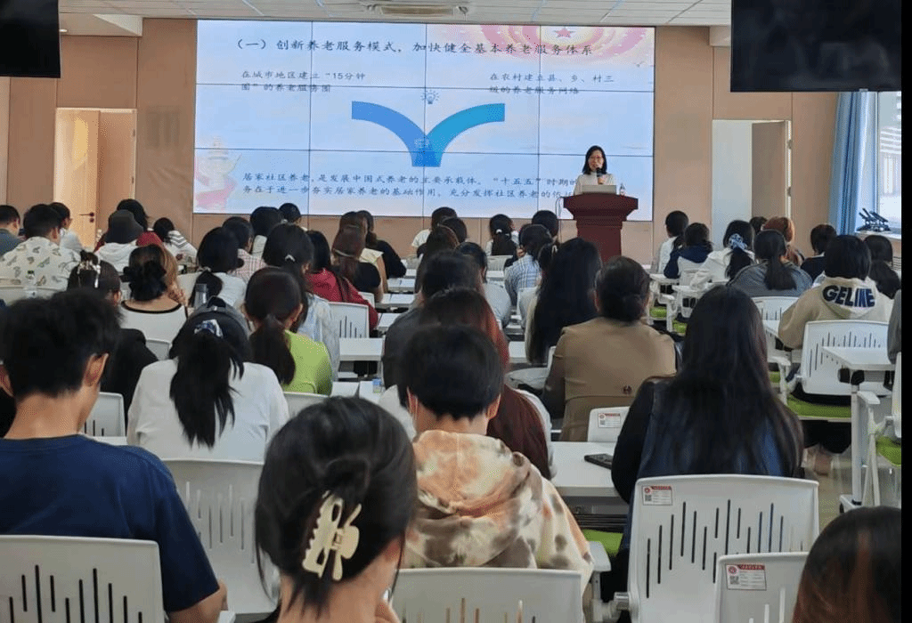 孔伟主任则以“实施积极应对人口老龄化国家战略,加快新时代医养结合高质量发展”为题,结合国家政策与实践案例,深入解读了医养结合在资源整合、服务优化与科技赋能方面的创新路径,并呼吁高校与企业共建“康养实训基地”,培养兼具人文关怀与专业技能的复合型人才。孔伟强调,青年学子应把握“银龄经济”机遇,在服务国家战略中实现自我价值。