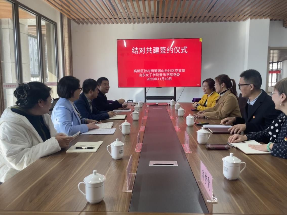 为探索校社党建合作新路径,构建资源共享、优势互补、协同发展的党建工作新格局,11月10日上午,音乐学院与高新区孙村街道御山台社区党支部在御山台社区举行结对共建签约仪式。音乐学院党委书记曲常军、院长宋小霞、党委副书记吕梅,孙村街道党工委副书记孙志霞、御山台社区党支部书记孙正文等出席活动。