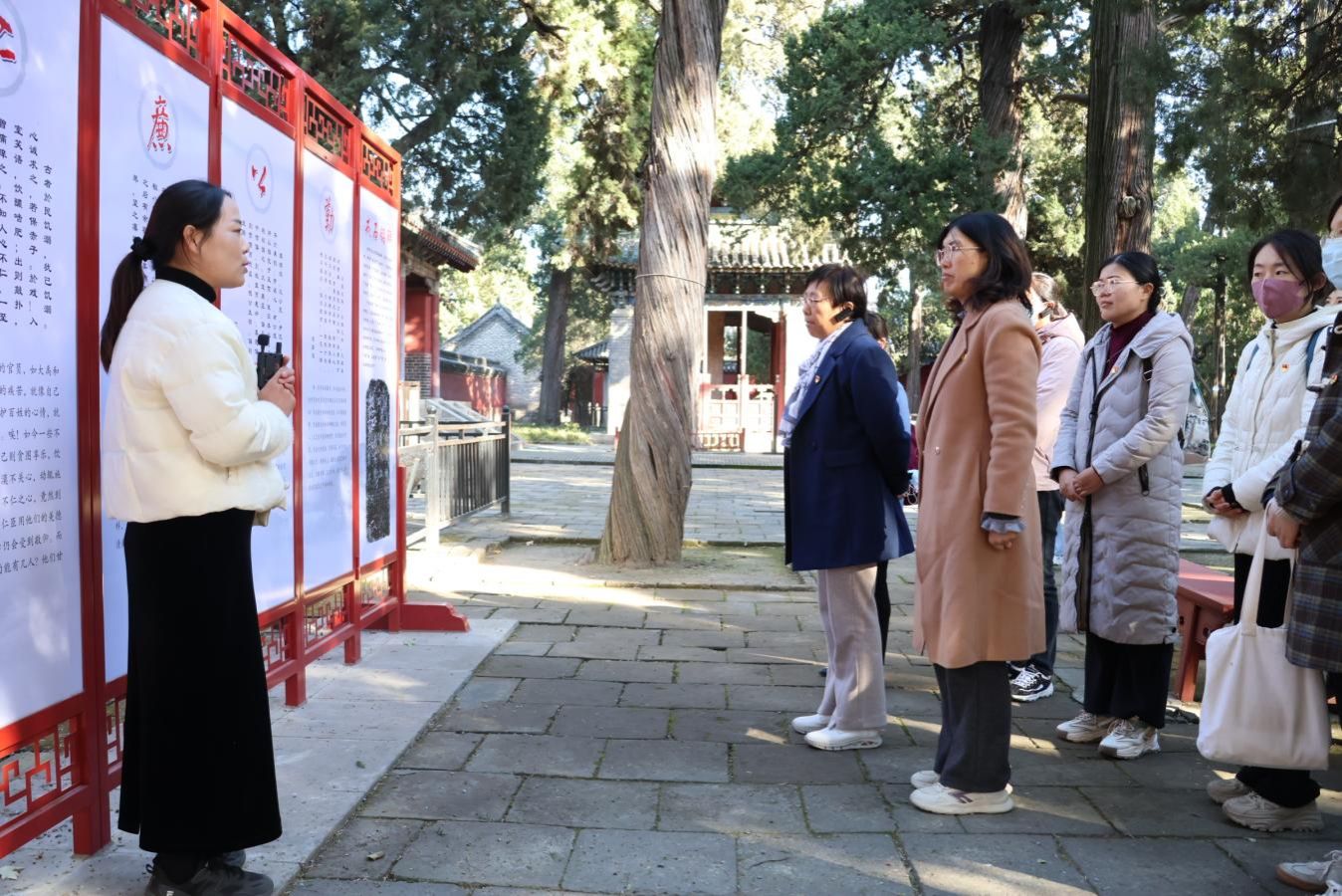 下午,学院一行前往孟府孟庙继续开展廉政教育。作为儒家文化的重要载体,孟府孟庙不仅承载着孟子“仁政”“民本”的思想精髓,更蕴含着“修身齐家”“廉洁自律”的廉政文化基因。在孟庙,党员教师们参观了亚圣殿、孟母殿等核心建筑,认真聆听孟子“富贵不能淫,贫贱不能移,威武不能屈”的浩然正气故事,深刻体会“修身为本、严于律己”的道德准则;在孟府,大家重点学习了孟氏家族“耕读传家、清廉传家”的家训家规,通过解读“居仁由义”的处世之道,进一步强化了“廉洁从教、廉洁修身”的思想意识。活动中,学院党委书记尹衍梅结合教育领域典型案例,勉励党员教师要以孟子思想为滋养,将廉政意识融入教学、科研等各项工作,做到心有所畏、言有所戒、行有所止。