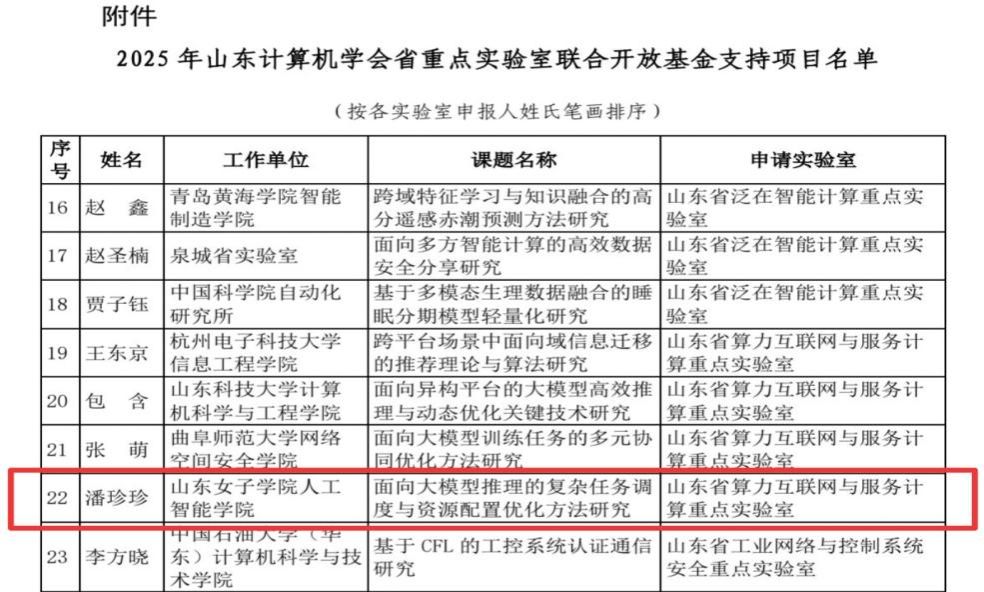 近日,山东省2025年度重点实验室开放基金项目评审结果揭晓,山东女子学院人工智能学院教工第一党支部潘珍珍、张晓芳两位教师主持申报的课题成功获批立项。这是该支部坚持党建引领,推动党建与业务工作深度融合,激发党员教师科研创新活力的又一重要成果。