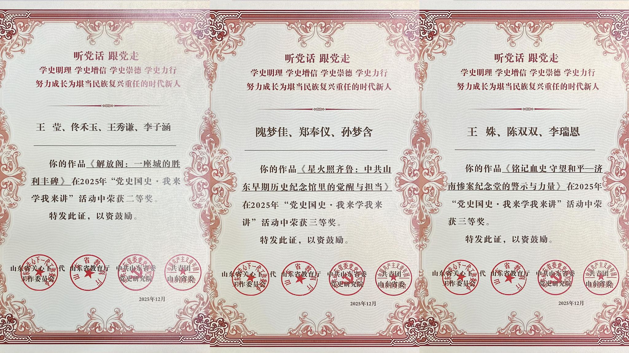 近日,由山东省关心下一代工作委员会、山东省教育厅、中共山东省委党史研究院、共青团山东省委联合主办的2025年“党史国史·我来学我来讲”活动圆满收官。我校学子荣获二等奖1项,三等奖2项。