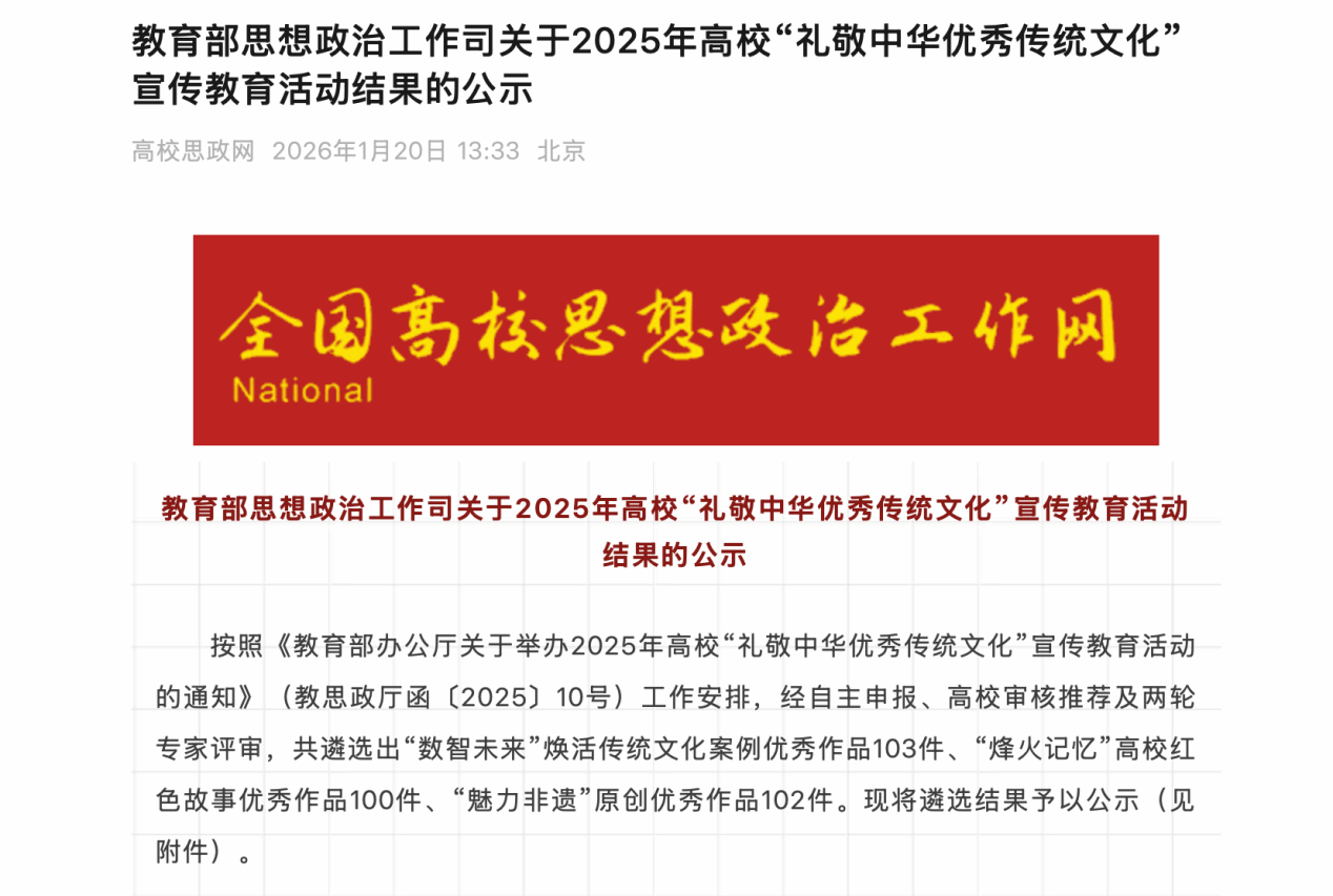 近日,教育部思想政治工作司公布2025年高校“礼敬中华优秀传统文化”宣传教育活动入选名单,数据科学与计算机学院“数缮文物 文化普惠”项目成功获奖,彰显了学校在文化科技融合与中华优秀传统文化传承创新领域的突出成果。