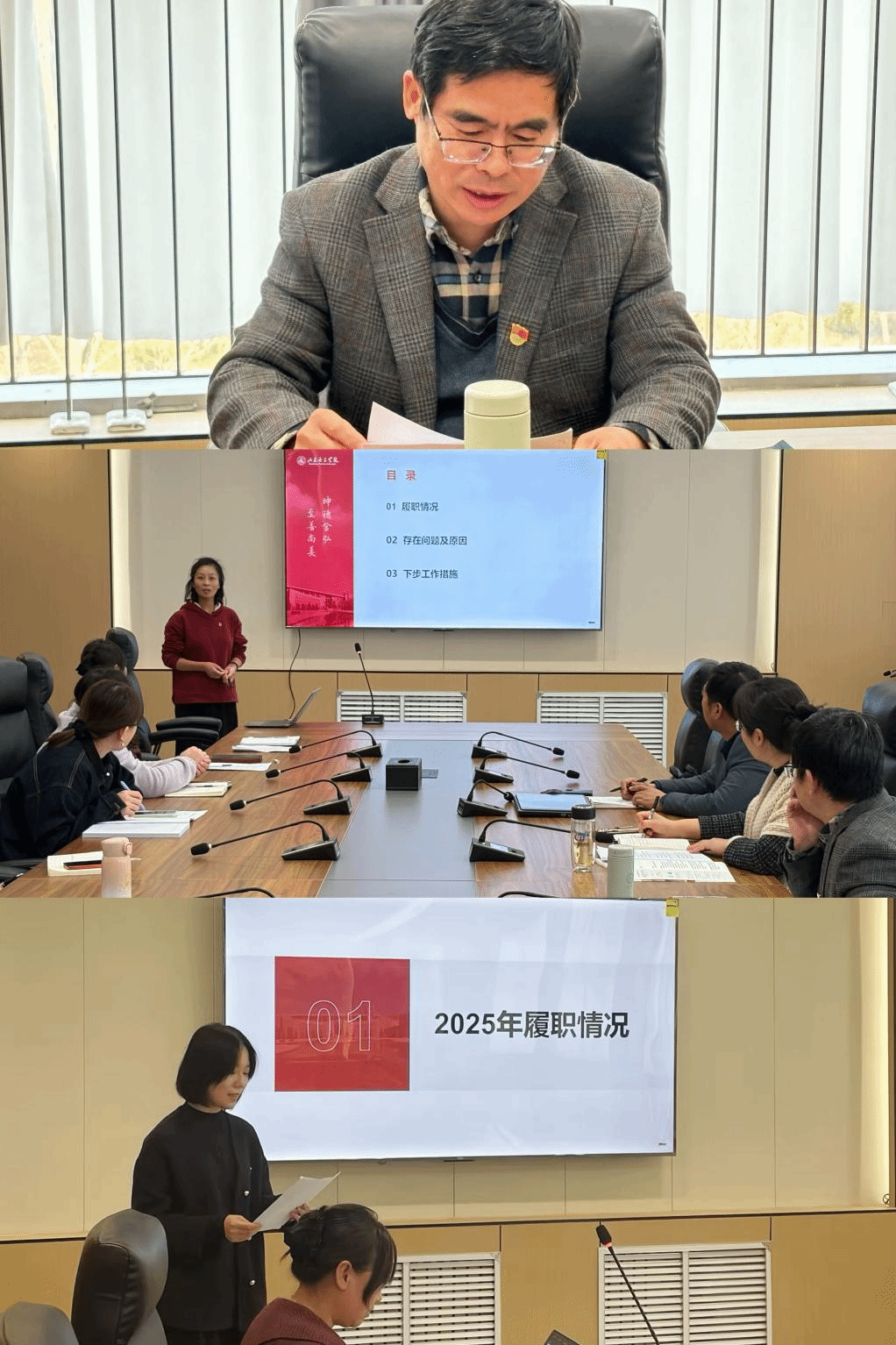 为深入贯彻落实新时代党的建设总要求,压紧压实基层党建工作责任,推动全面从严治党向纵深发展、向基层延伸,1月27日,健康养老学院在求新楼414会议室召开2025年度党支部书记全面从严治党述责述廉工作评议和抓基层党建工作述职评议会议。党委书记赵丽丽主持会议,学院党委委员、各党支部书记及委员参加会议。