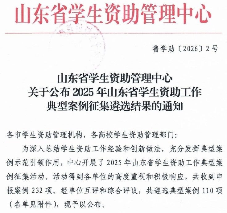 近日,山东省学生资助管理中心公布了2025年学生资助工作典型案例征集遴选结果。此次评选,全省共收到申报案例232项,最终遴选典型案例110项,我校报送的两项案例成功入选。