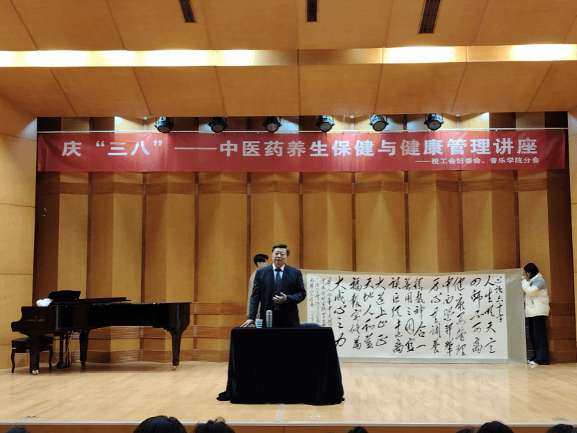 为庆祝第116个“三八”国际劳动妇女节,3月12日下午,由校工会妇委会与音乐学院分会联合承办的庆“三八”中医药养生保健与健康管理讲座在音乐厅举行。活动特邀知名中医专家马其江担任主讲,音乐学院院长宋小霞主持,马克思主义学院、健康养老学院、教育学院、会计学院、经济学院、传媒学院、艺术设计学院、音乐学院的师生代表参与活动。