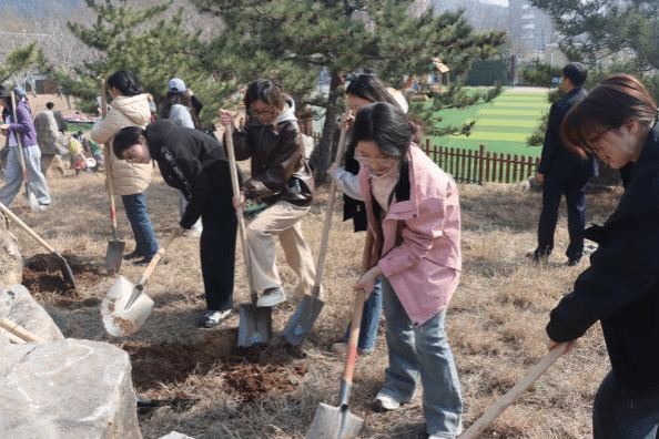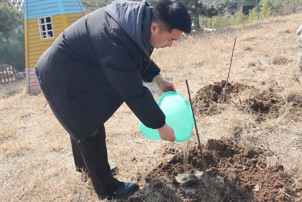 植树现场,老师和同学一起分工协作,拿起铁锹、水桶等工具,挖坑扶苗,填土压实,浇水灌溉,每一个环节都有条不紊,师生们默契配合,一株株树苗迎风挺立,焕发出蓬勃生机。
