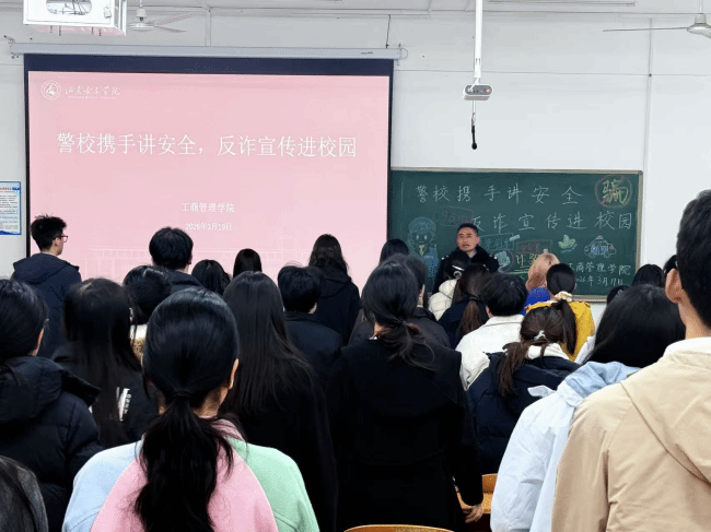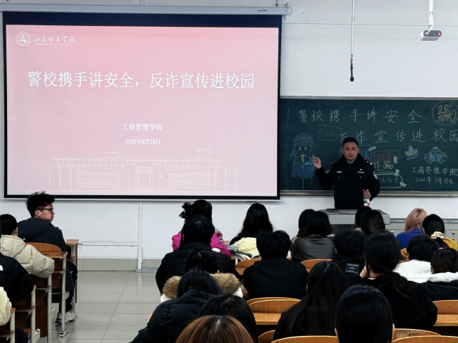 为进一步强化校园安全管理,提升学生反诈、防诈意识与防范能力,筑牢校园反诈安全屏障,3月19日,工商管理学院开展“警校携手讲安全,反诈宣传进校园”反诈安全知识讲座,活动特邀大学路派出所杨克警官担任主讲,学院党委书记耿华、党委副书记杨晓斐、安全员徐西英以及非毕业班纪检安全委员和各宿舍舍长参加讲座。