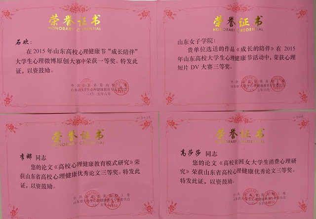会议对2015年山东省大学生心理健康节中的先进集体和个人进行了表彰。我校上报的参赛作品从全省122所高校的967副作品中脱颖而出,经济管理学院2014级人力资源与管理本科班石欢同学的微博作品获原创大赛一等奖,信息技术学院选送的心理情景剧《成长的陪伴》获心理剧短片DV大赛三等奖,教育学院李娜老师、会计学院高莎莎老师的论文获得心理健康优秀论文三等奖。