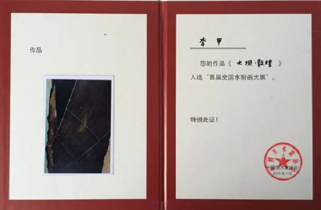 近日,我校教师李甲的作品《大坝·敦煌》,收到了中国美术家协会颁发的收藏证书及相关证明,并被石家庄美术馆收藏。这是继今年2月《大坝.敦煌》入选由中国美术家协会举办的“首届全国水粉画大展”之后的又一喜讯。