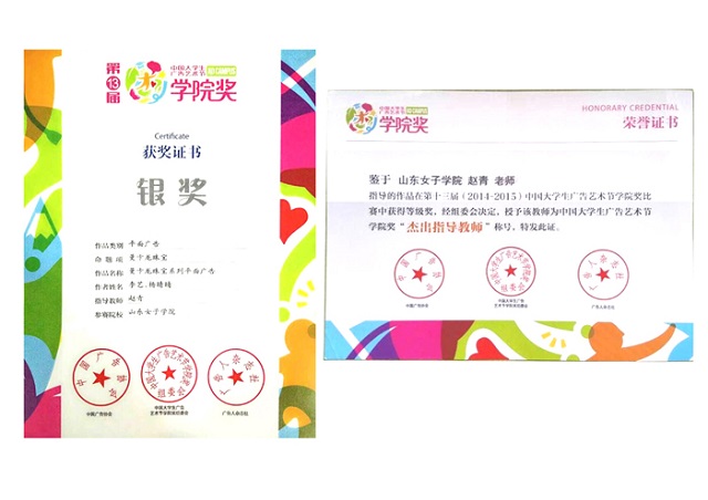 近日,由中国广告协会主办,《广告人》杂志承办的“第十三届中国大学生广告艺术节学院奖”颁奖典礼在中央电视台梅地亚中心举行。我校学生李艺、杨晴晴设计制作的麦卡龙珠宝系列平面广告获得银奖,并获得奖金3000元,指导教师赵青获得“杰出指导教师”称号。