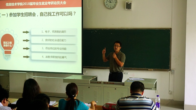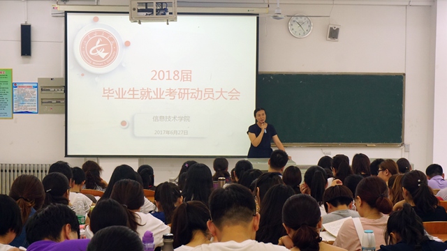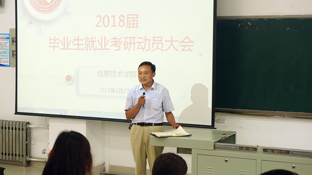 为更好地做好2018届毕业生的实习、就业、升学等相关工作,帮助2018届毕业生尽早地树立正确的考研观、就业观,提供精准科学的就业指导,6月28日上午,信息技术学院2018届毕业生就业考研动员大会在博文楼110顺利举行,信息技术学院全体教师、2018届全体毕业生参加会议。