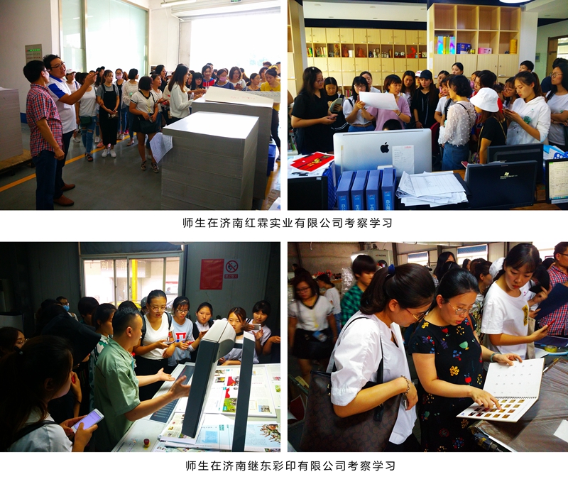 红霖实业公司设计部祝总监带领师生们参观了设计部、策划部,介绍了设计部工作流程和印前设计相关知识;公司李总监带领学生们参观了印刷车间,与专业老师们在印刷车间共同讲解印刷工艺与印刷流程,并就学生们的提问进行了详细解答。在济南继东彩艺印刷有限公司的印刷车间,公司工作人员热情接待了师生,并结合设计案例就印后加工和纸样特性进行了充分解读。