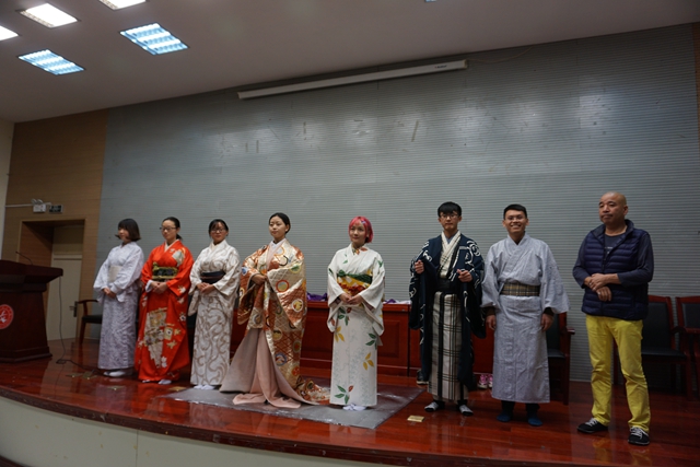 近日,外国语学院邀请日本著名和服表演大师富田伸明在图书馆一楼报告厅举办了和服表演及专题文化讲座,来自全校各院系的200余名师生参加了讲座。这也是外国语学院主办的“女性教育与亚洲共同体”系列讲座的第八讲。