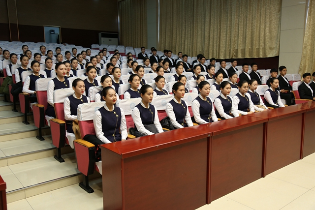 近日,旅游学院在图书馆一楼报告厅举行2017级空中乘务专业学生授服仪式。学校学生处、招生就业处、旅游学院相关负责人和东方领航教育集团负责人,以及2017级空中乘务专业全体学生参加该仪式。