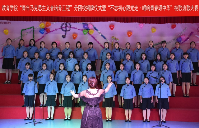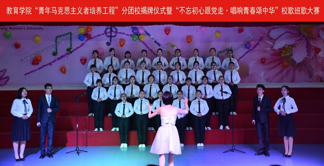 唱青春赞歌,展女院风采。2017年12月7日下午13点,教育学院于博文楼508举行“青年马克思主义者培养工程”分团校揭牌仪式暨‘不忘初心跟党走·唱响青春颂中华’校歌班歌合唱比赛。学校团委副书记王鲁、教育学院团总支书记、辅导员、以及部分专业教师莅临本次活动并担任评委,学院部分学生参加此次活动。