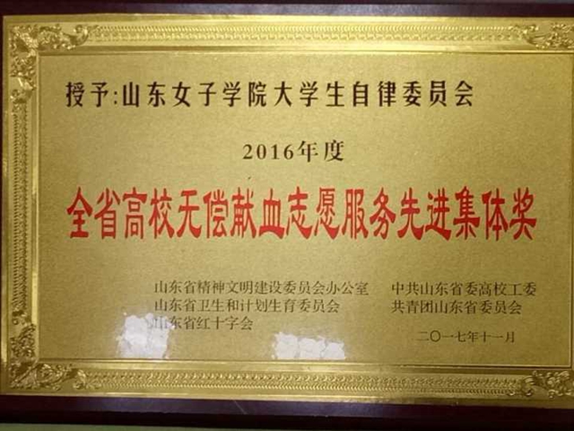12月7日,由省文明办、省委高校工委、省卫生计生委、团省委、省红十字会主办,省献血办公室、省血液中心承办的2016年度驻济高校无偿献血表彰会在山东大厦举行。会上对在2016年度全省高校无偿献血工作中贡献突出的集体和个人进行了表彰。我校荣获“2016年度全省无偿献血先进高校”荣誉称号,2位老师荣获“2016年度全省高校无偿献血工作先进个人”荣誉称号,7名同学被评为“2016年度全省无偿献血爱心大学生”,校大学生自律委员会荣获“2016年度全省高校无偿献血志愿服务先进集体”荣誉称号,1名同学被评为“2016年度全省高校无偿献血志愿服务先进个人”。
