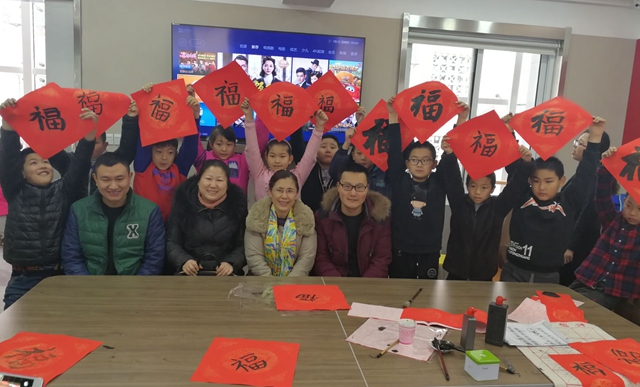 活动现场,书法老师带领小书法家们展纸平铺、挥毫泼墨,仅仅一个多小时,桌上已铺满了百余幅散发着浓郁墨香的春联和“福”字。居委会主任和师生们将福字和春联亲手送给老人,祝老人新春快乐,金狗旺福。拿到春联的老人们个个喜不自禁、爱不释手。本次活动中,在甸柳新村第二社区综合养老服务中心实习的2015级老年服务与管理的学生自觉践行“爱心、尊重和助老自助”的老年社会工作理念,进行了认真的组织和策划,保证了活动的圆满顺利。