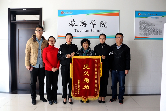 11月13日上午,济南市长清区常春藤社区居民李兆芳的家属来到学校旅游学院。见到旅游学院的老师,家属有些激动,并提出要向2018级空乘专业学生付丽、刘陆陆赠送“见义勇为”锦旗。