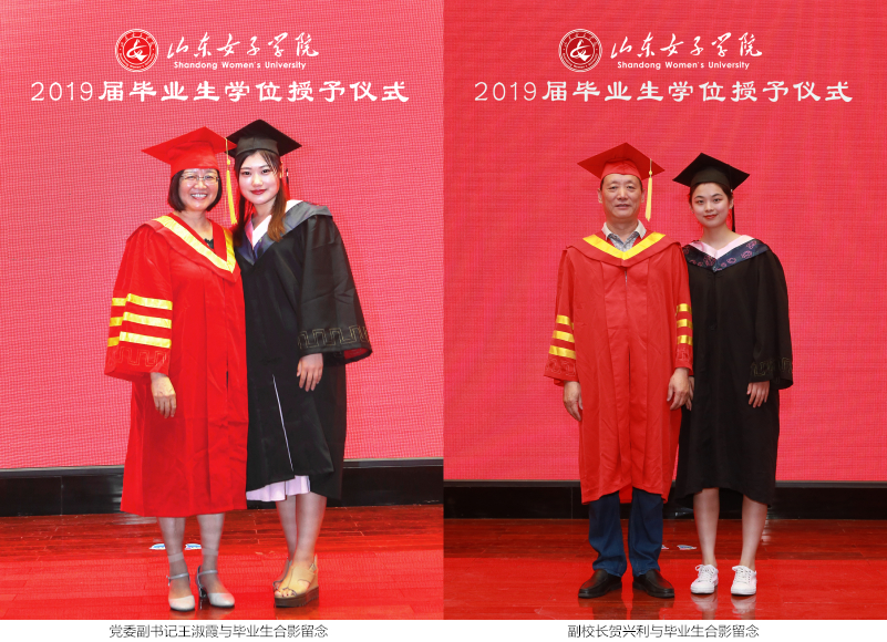 副校长贺兴利宣读了山东女子学院2019届普通本专科学生毕业资格及学位授予决定,纪委书记黄晓彦宣读了2019届省级、校级优秀毕业生表彰决定,副校长侯素美宣读了2019届校友信使聘任决定,全体校领导为学生代表颁发优秀毕业生荣誉证书和校友信使聘书。王淑霞为2019年大学生志愿服务西部计划志愿者披挂绶带、佩戴光荣花并赠送旅行箱。