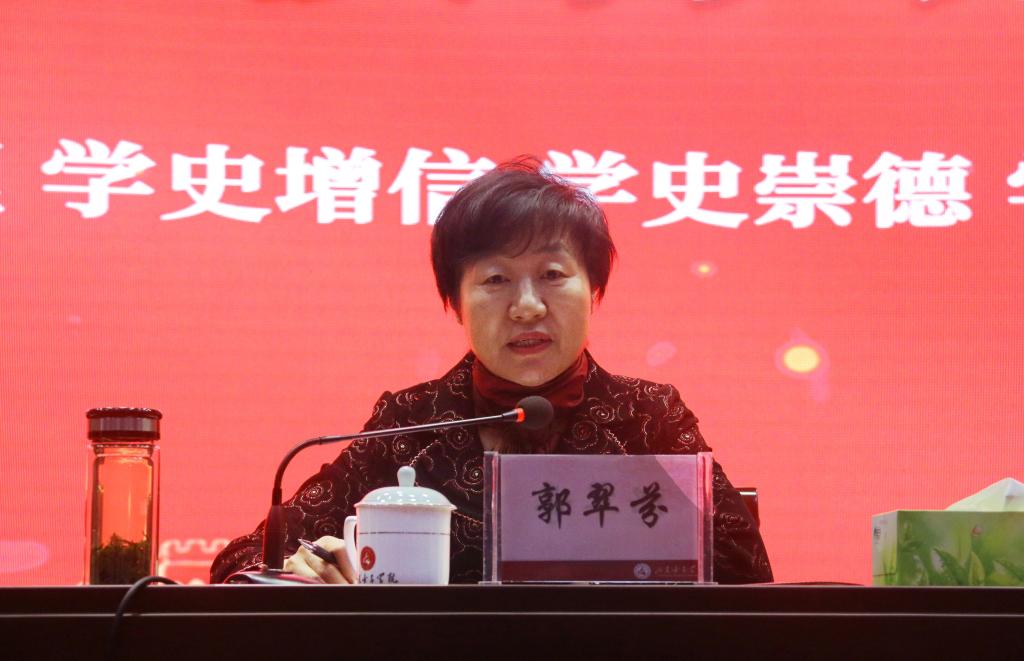 郭翠芬强调,要立足工作实际,扎实推进党史学习教育高质量开展,做到规定动作落实到位不走样,自选动作特色鲜明有深度。一要加强政治引领,坚决做到“两个维护”;二要强化理论武装,感悟思想伟力;三要突出师生群体,拓展学习教育覆盖面;四要牢记初心使命,办好师生实事,开展联系师生“大走访”、师生难题“大排查”和服务师生“大提升”,真正为师生员工解难事、办实事、做好事,切实增强师生的获得感、幸福感、安全感;五要改作风提能力,积极担当作为。要加强组织领导,严格落实责任,坚持以上率下,创新方式方法,营造浓厚氛围,确保党史学习教育取得实效。