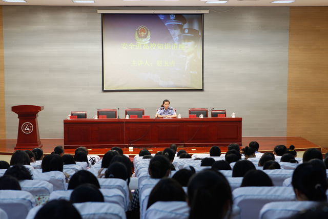 聘任仪式后,“安全辅导员”赵玉洁警官为我校近200名学生作了《安全进高校》的首堂安全讲座。(山东女子学院)