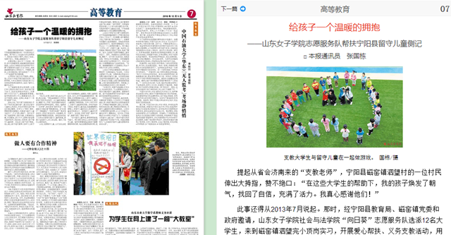 山东女子学院“向日葵”志愿服务队在宁阳县磁窑镇泗望完小开展支教活动已有三个年头了。无论寒暑,他们都热忱不改;不管冬夏,他们始终如一。志愿者韦思慧的父亲身患癌症,但她依然来到这里顶岗实习。她深有感触地说:“自信可以让一个人变得更有魅力。我们通过‘大手拉小手’,与留守儿童一起成长、共同提高,帮助他们找回了笑容,挺直了腰杆。如今,这些孩子变得开朗豁达、富有自信了。同时,我感到自己变得更加坚强、勇敢了。对于我们自身而言,支教活动是一种专业水平的提高。我希望能够尽最大的努力去帮助孩子们,用自己的爱心与智慧擦亮他们生命的底色。”目前,磁窑镇泗望完小已经接受山东女子学院70多人次的义务帮扶。