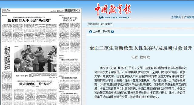 日前,全面二孩生育新政暨女性生存与发展研讨会在山东女子学院召开。来自中国妇女研究会、全国妇联妇女研究所、北京大学、南京大学、山东社科院人口所及俄罗斯彼尔姆国立大学等科研单位和高校的专家学者,围绕“性别—生育双重税赋”与女性家庭—工作的矛盾冲突、0-3岁儿童抚育的公共需求与公共政策研究、俄罗斯母亲基金政策实施效果、全面二孩政策与女性就业际遇、全面二孩政策的社会经济效应、全面二孩政策后家庭支持政策的改革与完善等议题进行了深入研讨。此外,会议还征集了近80篇重点研究全面二孩政策的相关科研论文。