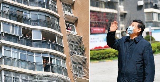 2020年3月10日,中共中央总书记、国家主席、中央军委主席习近平专门赴湖北省武汉市考察新冠肺炎疫情防控工作。这是习近平在东湖新城社区考察时,向在家隔离居住的居民挥手致意、表示慰问(拼版照片)。 新华社记者 谢环驰/摄