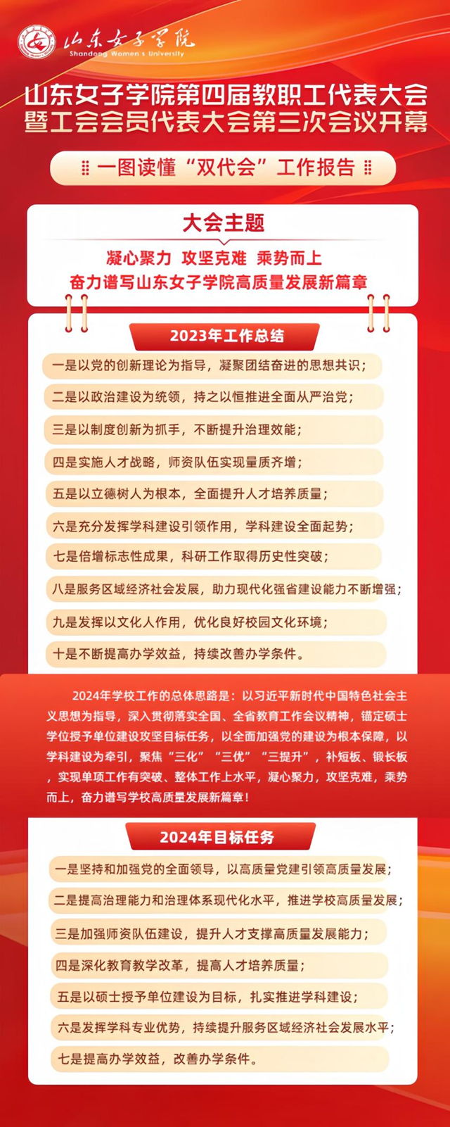 学校党委副书记、校长李光红作工作报告。报告从十个方面回顾总结了学校2023年取得的成绩:一是以党的创新理论为指导,凝聚团结奋进的思想共识;二是以政治建设为统领,持之以恒推进全面从严治党;三是以制度创新为抓手,不断提升治理效能;四是实施人才战略,师资队伍实现量质齐增;五是以立德树人为根本,全面提升人才培养质量;六是充分发挥学科建设引领作用,学科建设全面起势;七是倍增标志性成果,科研工作取得历史性突破;八是服务区域经济社会发展,助力助推现代化强省建设能力不断增强;九是发挥以文化人作用,优化良好校园文化环境;十是不断提高办学效益,持续改善办学条件。2024年是新中国成立75周年,也是实现“十四五”事业发展规划目标任务的关键一年。报告明确了2024年学校工作的总体思路,聚焦“三优”“三化”“三提升”,固底板、补短板、锻长板,努力实现特色工作创亮点,重点工作有突破、整体工作上水平,凝心聚力、攻坚克难、乘势而上,新起点上持续推进女院高质量发展!报告从九个方面、20条工作举措对2024年的重点工作任务进行部署:一是师资队伍建设优化;二是学科专业布局优化;三是师均科研经费优化;四是教育教学数字化;五是产教融合协同化;六是人才培养国际化;七是大学文化提升;八是育人环境提升;九是办学条件提升。
