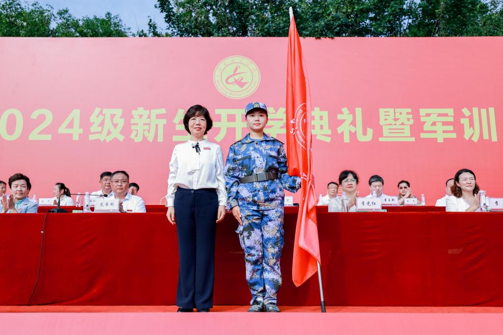 党委书记吕晓黎向新生代表授校旗。党委副书记、校长李光红发表了题为《启程于青春奋斗梦想路 相会于中华腾飞世界时》的讲话,为全体新生开启“开学第一课”。她首先欢迎6475名新同学加入女院大家庭,并介绍了学校的发展历史和近年来取得的办学成绩。她指出,同学们置身全面推进强国建设、民族复兴伟业的关键时期,生逢其时、重任在肩。就如何在女院这片育人的沃土上“蝶变”为栋梁之材,她和同学们共同探讨四个问题“未来中国将以什么样的气象呈现在世界面前”“青年学生将以什么样的姿态呈现在时代面前”“青年学生以什么样的状态度过大学生活”“青年学生将以什么样的心态成为一名全面发展的人”。激励同学们带着思考、付诸行动,立足当下、求索未来,不懈奋斗、久久为功,学有所成、学有所获,努力成为最好的自己、女院的荣光、中国式现代化的建设者!
