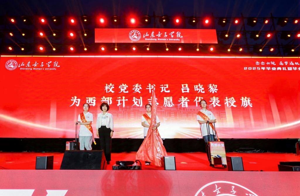 党委书记吕晓黎为西部计划志愿者代表授旗并赠送纪念品。随后,吕晓黎点燃主火炬,与毕业生代表共同完成“薪火相传 光耀征程”火炬传递仪式。