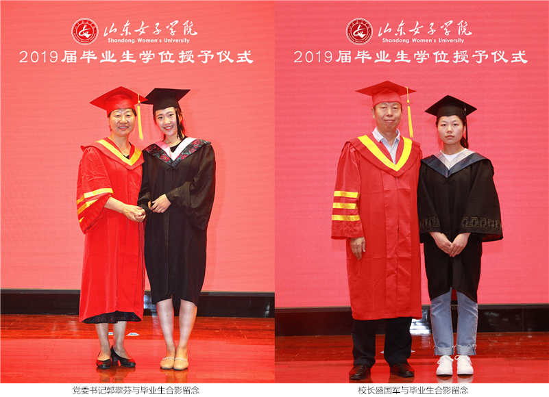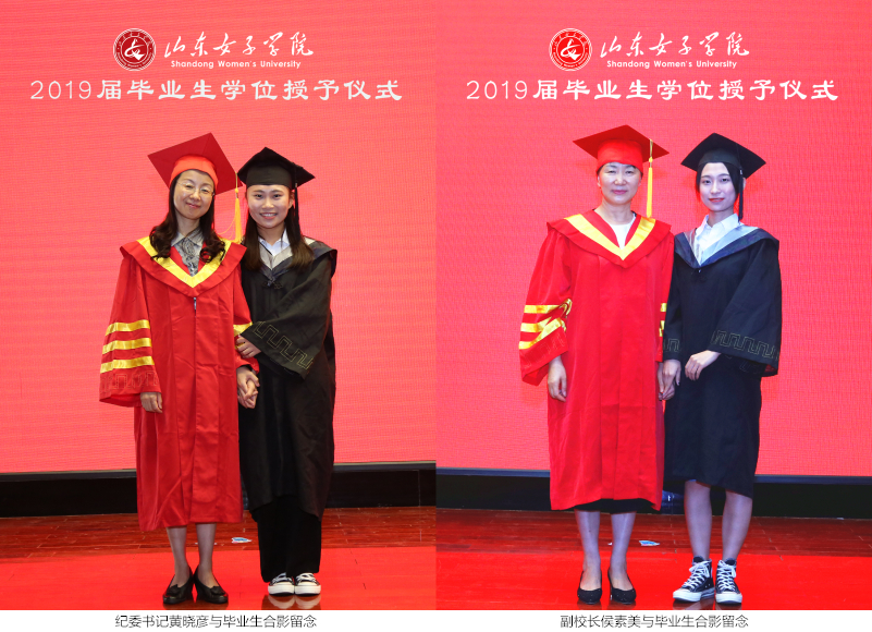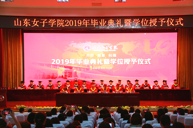 副校长贺兴利宣读了山东女子学院2019届普通本专科学生毕业资格及学位授予决定,纪委书记黄晓彦宣读了2019届省级、校级优秀毕业生表彰决定,副校长侯素美宣读了2019届校友信使聘任决定,全体校领导为学生代表颁发优秀毕业生荣誉证书和校友信使聘书。王淑霞为2019年大学生志愿服务西部计划志愿者披挂绶带、佩戴光荣花并赠送旅行箱。