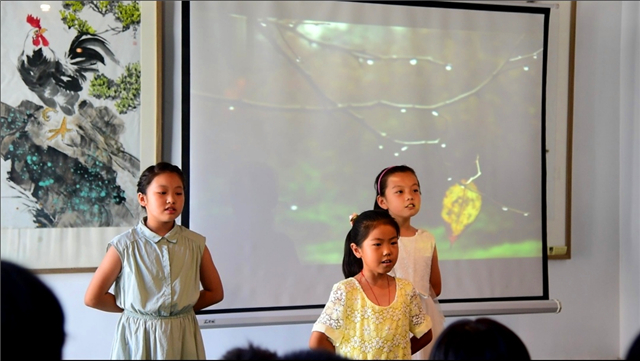 三位声音甜美的女孩带来学堂乐歌《送别》小合唱,稚嫩纯净的童声拨动了不少人的心扉。合唱中队形,动作的变化为节目增色不少。志愿者在歌曲的间奏安排了朗诵的环节,女孩们的诵读声余音绕梁,展现出了她们积极向上的精神,赢来了大家的阵阵掌声。