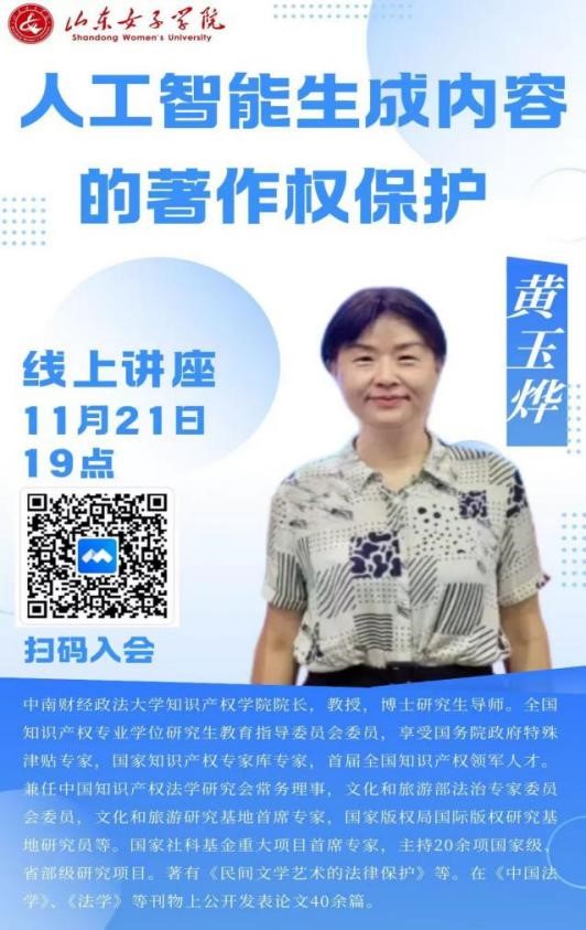 11月21日,社会发展学院邀请中南财经政法大学黄玉烨教授为师生开展题为“人工智能生成内容的著作权保护 ”的学术讲座,社会与法学院师生100余人通过线上方式参加。