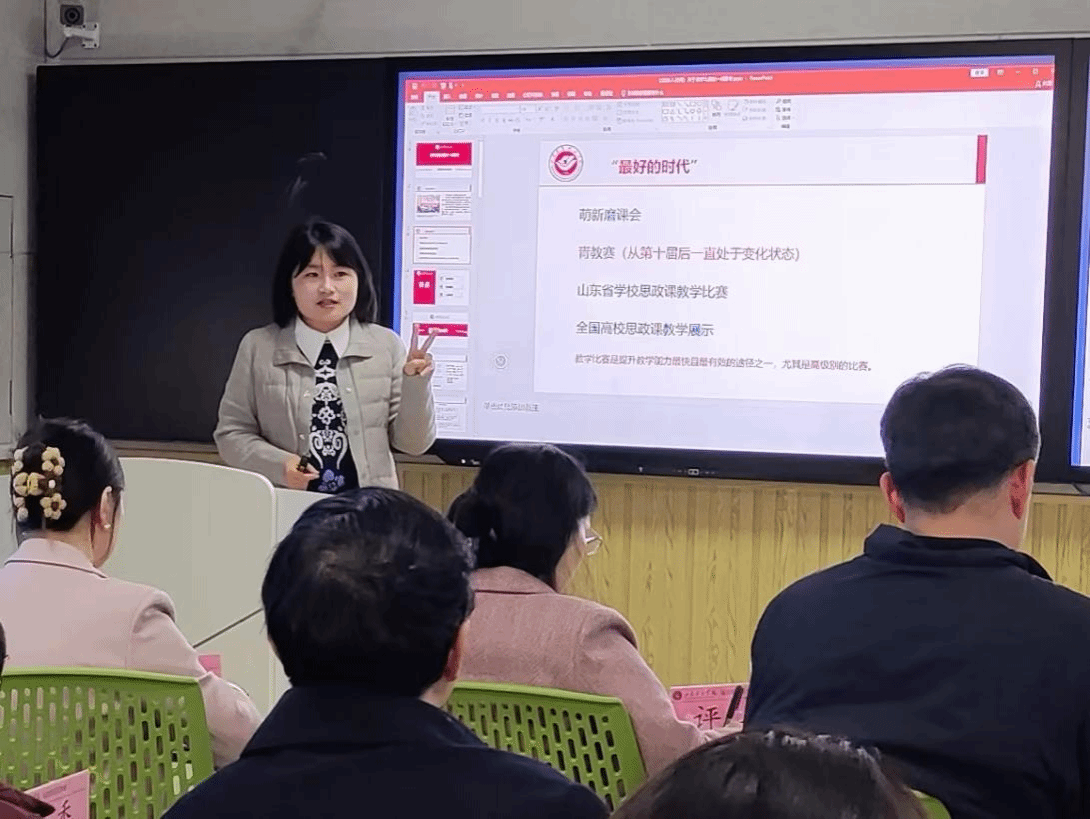 随后,全国高校思政课教学展示活动二等奖、山东省高校青年教师教学比赛一等奖获得者,山东青年政治学院教师岳倩结合参加省青教赛及全国思政课教学比赛的丰富经验,围绕备赛心路、教学设计精髓、课堂呈现技巧及成果转化应用等方面作精彩分享,为在场教师提供参考与启发。