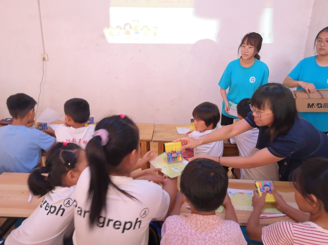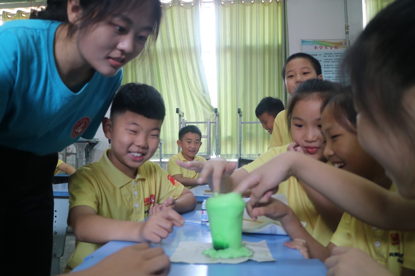 (五)汇报演出道离别,不负遇见共成长。十天的志愿服务转瞬即逝,志愿者带领学堂里的孩子们用一场别开生面的汇报演出和互动游戏为支教生活画上了一个圆满的句号。合唱、舞蹈、朗诵、书法作品、科学小实验现场演示……一个个的精彩节目既是对支教成果的检阅,亦是师生离别情绪的真情流露。