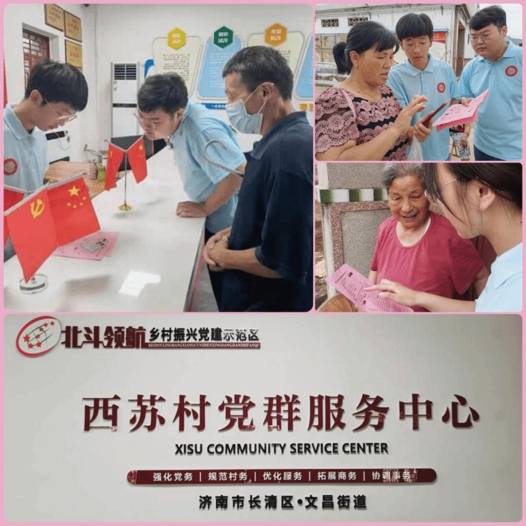 村官体验实践队的同学们在西苏村党群服务中心,协助村委工作人员整理日常村务和党建工作资料,帮助村民完成线上医保信息的注册,宣传倡导文明健康、绿色环保的生活方式,体验真实的日常村官工作。
