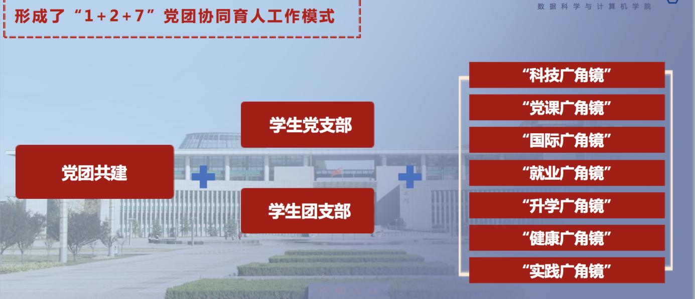 2023年,学院党委深入贯彻落实新时代党的建设总要求,将团建纳入“大党建”工作重点范围内,强化思想政治引领,筑牢理想信念根基,与学生成长同频共振,形成了“1+2+7”党团协同育人工作模式。“1”指的是一个核心思想,即党团一体化建设,以党建带团建,以团建促党建,在党团共建中实现协同育人的核心;“2”指数据科学与计算机学院学生党组织(3个学生党支部)和学生团组织(60个团支部)为两个主体;“7”指的是围绕学生成长相关的七项板块开展相关活动:科技、党课、国际形势、就业、升学、健康、实践,在活动中推动党团共建。