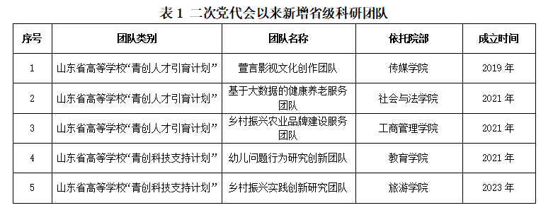 第二次党代会以来,学校新增国家级课题20项、省部级课题174项。出版学术著作102部,发表CSSCI、SSCI、SCI等高水平论文300余篇,获省部级以上科研成果奖16项。特别是2023年,学校“科研筑峰”取得重大突破,立项国家社科基金项目立项5项,位列省属高校第10名(其中,教育学立项2项,位列全省第2名);国家社科基金项目结项首获结项鉴定“优秀”等级1项,“良好”等级1项;获山东省第三十六届社会科学优秀成果奖一等奖2项,二等奖1项,三等奖1项,获奖数量与层次位居全省同类院校第一名,一等奖获奖数量位居全省第7名;教师作为通讯作者在经济学类顶级期刊《经济研究》发表论文。
